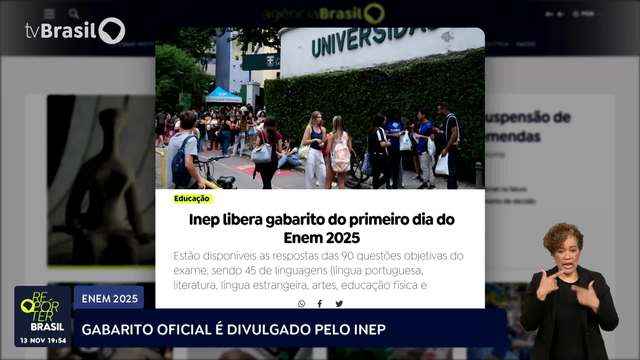 Inep divulgou o gabarito oficial do primeiro dia do Enem 2025. Os candidatos já podem conferir as respostas das noventa questões objetivas nas áreas de linguagens e ciências humanas, de acordo com a cor do caderno de prova. O número de acertos não indica a nota final, já que o cálculo usa a Teoria de Resposta ao Item, que considera o grau de dificuldade das questões. O segundo dia de provas será no próximo domingo, com matemática e ciências da natureza. Os detalhes estão no site da Agência Brasil.